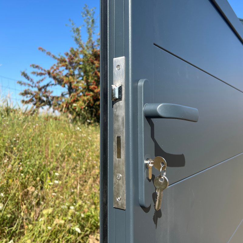 - Serrure : Serrure réversible barillet 3 clés, poigné aluminium avec visserie
