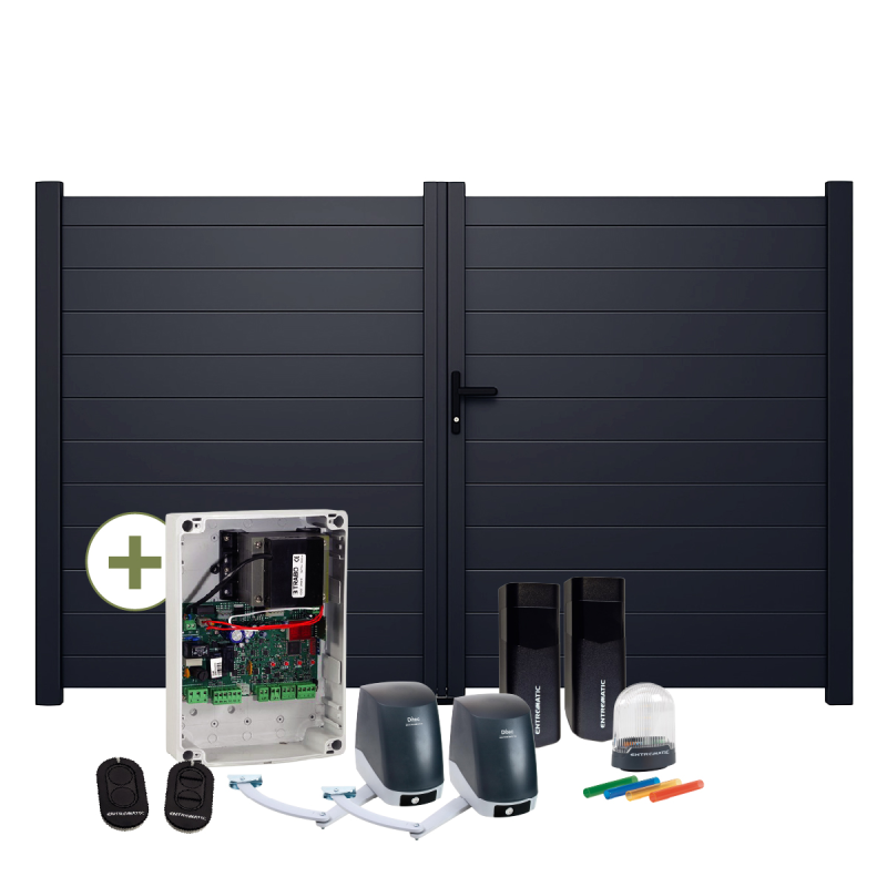 Le pack portail battant KOTOR motorisé constitue une solution complète pour équiper votre entrée d’un portail aluminium design et sécurisé, doté d’une motorisation à bras articulés performante.