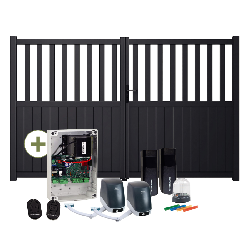 Le pack portail battant ALHAMBRA motorisé constitue une solution complète pour équiper votre entrée d’un portail aluminium esthétique, robuste et sécurisé, animé par une motorisation à bras articulés performante.
