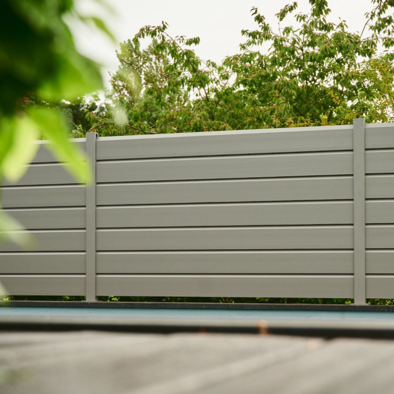 Le poteau en aluminium Elyo s'adapte également parfaitement avec les lames de clôture composite.